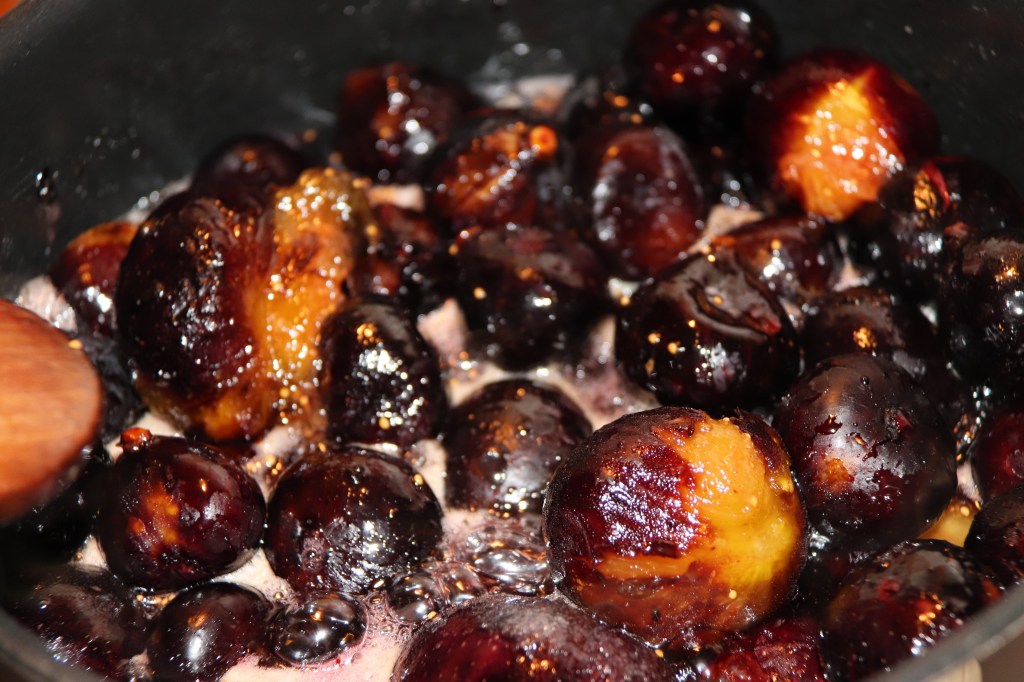 Le lendemain mettre sur feu doux et laisser cuire 1h à l’ébullition vous pouvez aller jusqu’à 1h30 (au delà de ce temps elles vont commencer à compoter et je voulais vraiment le fruit entier)
