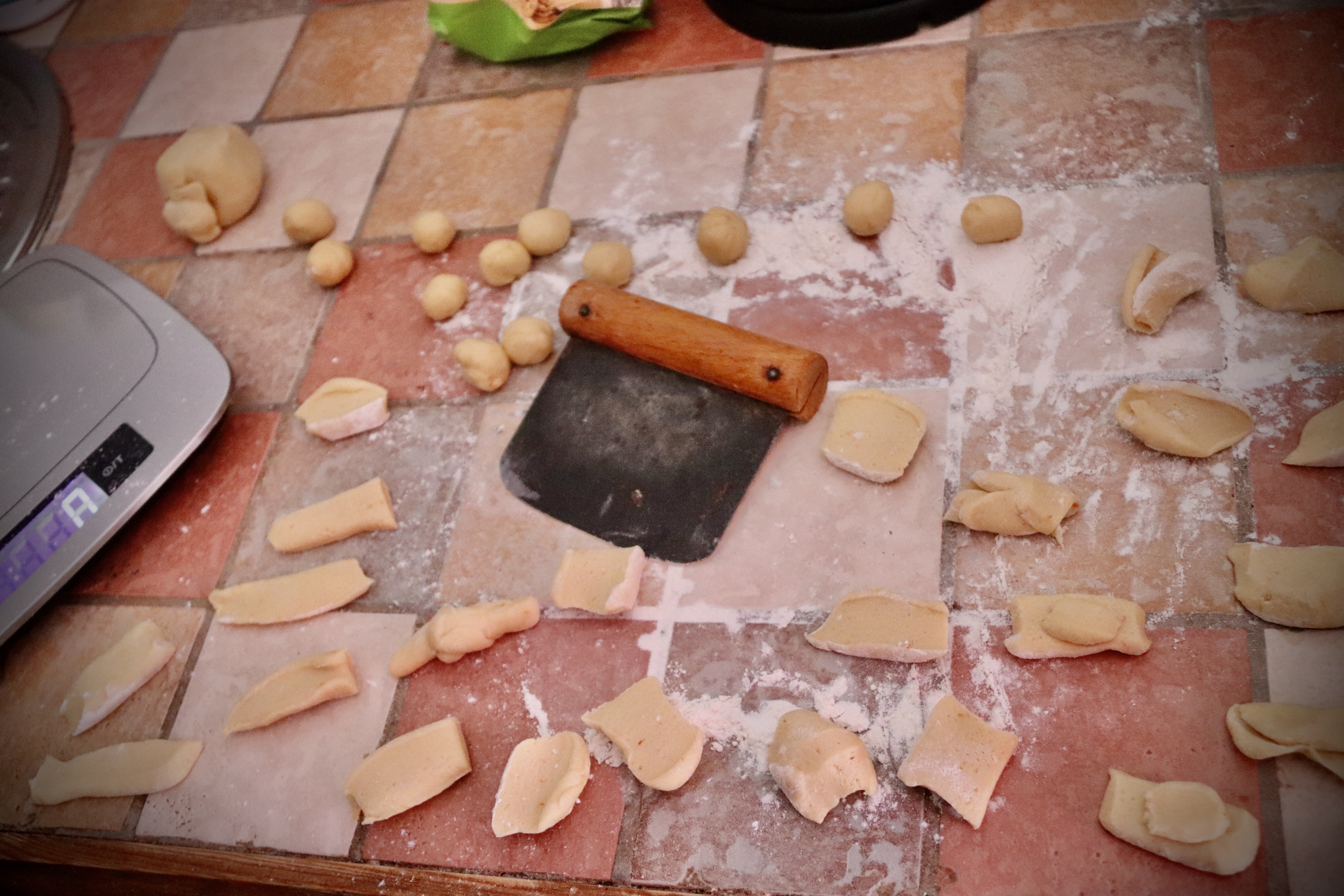Au bout de ce temps sortir la pâte restante du frigo et détailler 12 pâtons de 6g (les têtes) et 24 pâtons de 8 g (les membres)