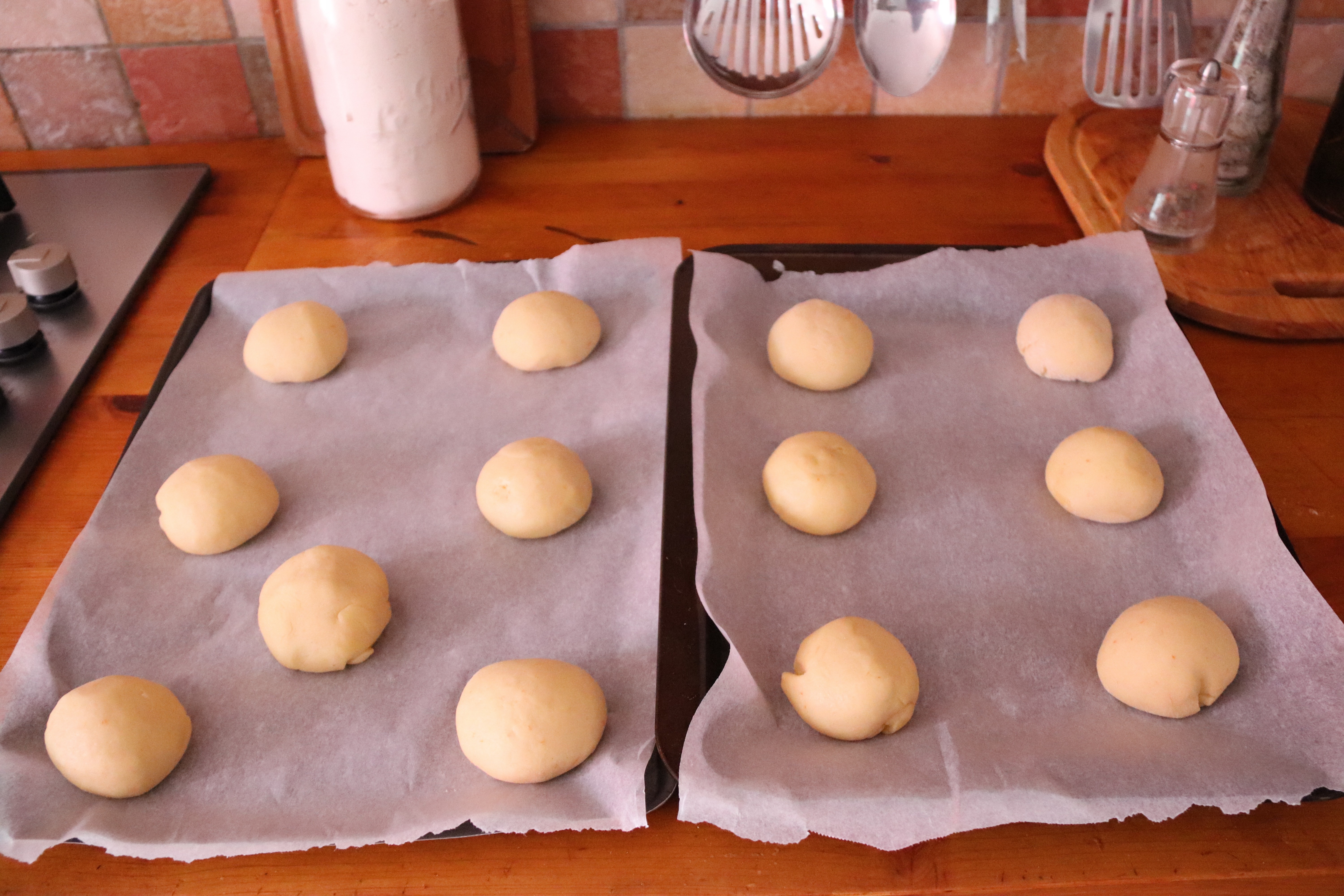 Le lendemain sur un plan de travail fariné détailler 12 pâtons de 65g chacun les façonner en boule et les placer sur une plaque recouverte de papier sulfurisé.