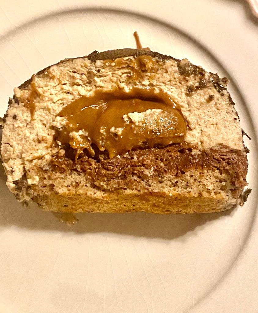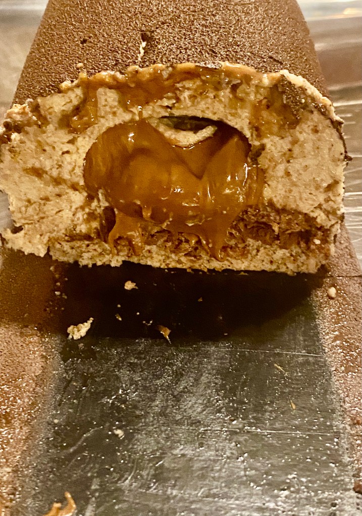 Elle est regressive avec son coeur coulant au pur praliné, très peu sucrée malgré tout avec une mousse aérienne 100% noisette, le tout posé sur une dacquoise et un croustillant praliné.