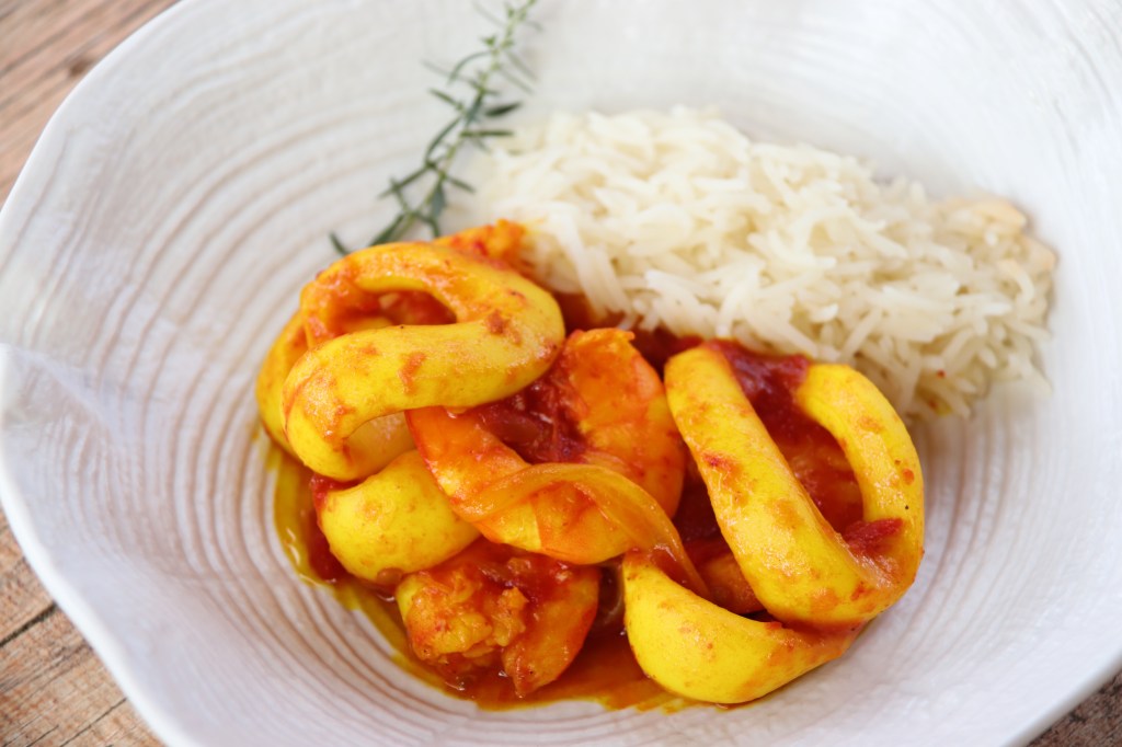 Je voulais la réaliser avec des lamelles de seiche ma poissonnière n’avait que des anneaux j’ai rajouté quelques crevettes, un petit riz basmati et voilà mon plat du dimanche midi.